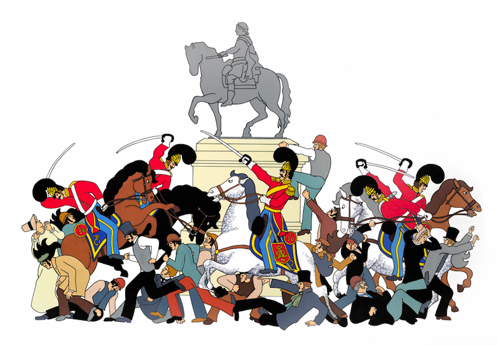 What’s the story behind the Queen Square image that you created for the Bristol Pound competition? My Queens Square riot picture was inspired by the graffiti of Scott Barden on the Bath Road in Brislington. Scott had depicted the 1831 riot and this piece had stood the test of time. It was in place when I moved to Bristol in 2003 and it has only (in the last few months of 2017) been sprayed over by other painters. I loved this image, but I felt that I could do a version that was more dynamic and stylised. I also felt that the images created at the time, in 1831, were not really very interesting. They focused on the destruction of property rather than the people involved in the riot. It took about two years and repeated attempts to improve the image before it arrived in its current state. I read several book about the events of the riot, took pictures of the statue in Queens Square and studied the clothes and uniforms of the period. A lot of research has to go into a historical image if you want to try and present it as an accurate reflection of an actual event.